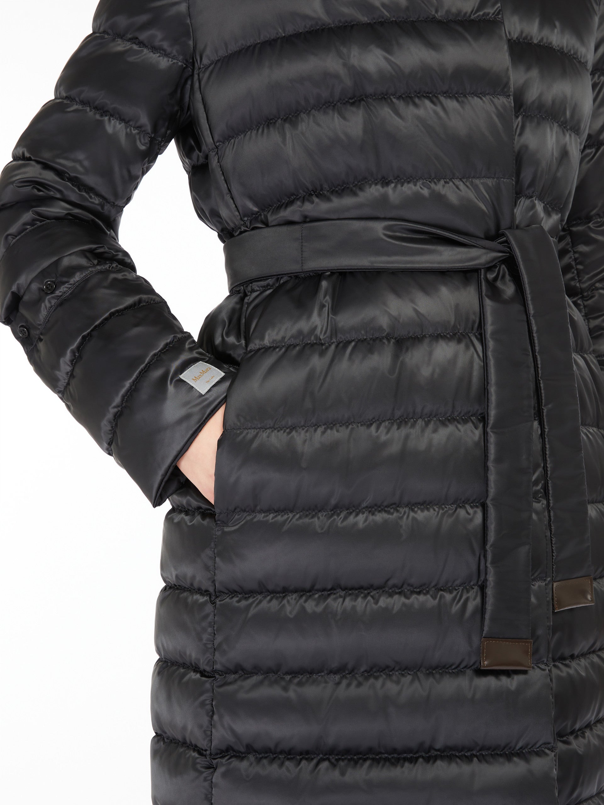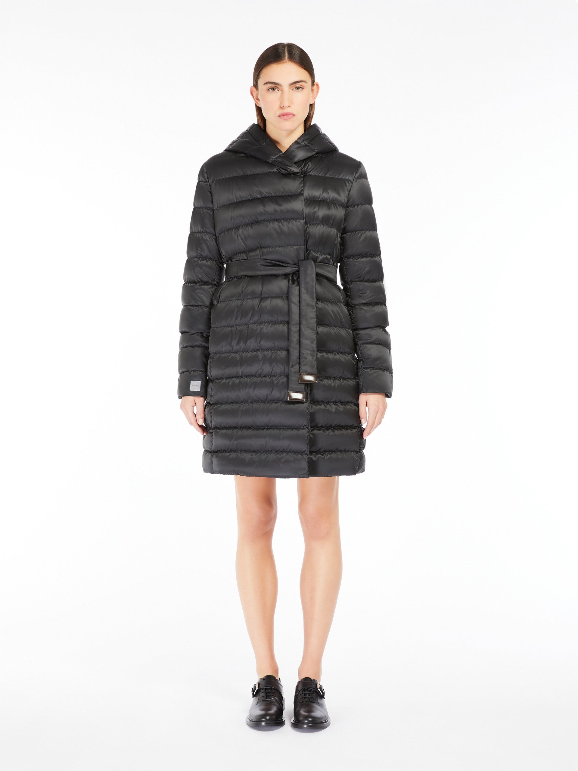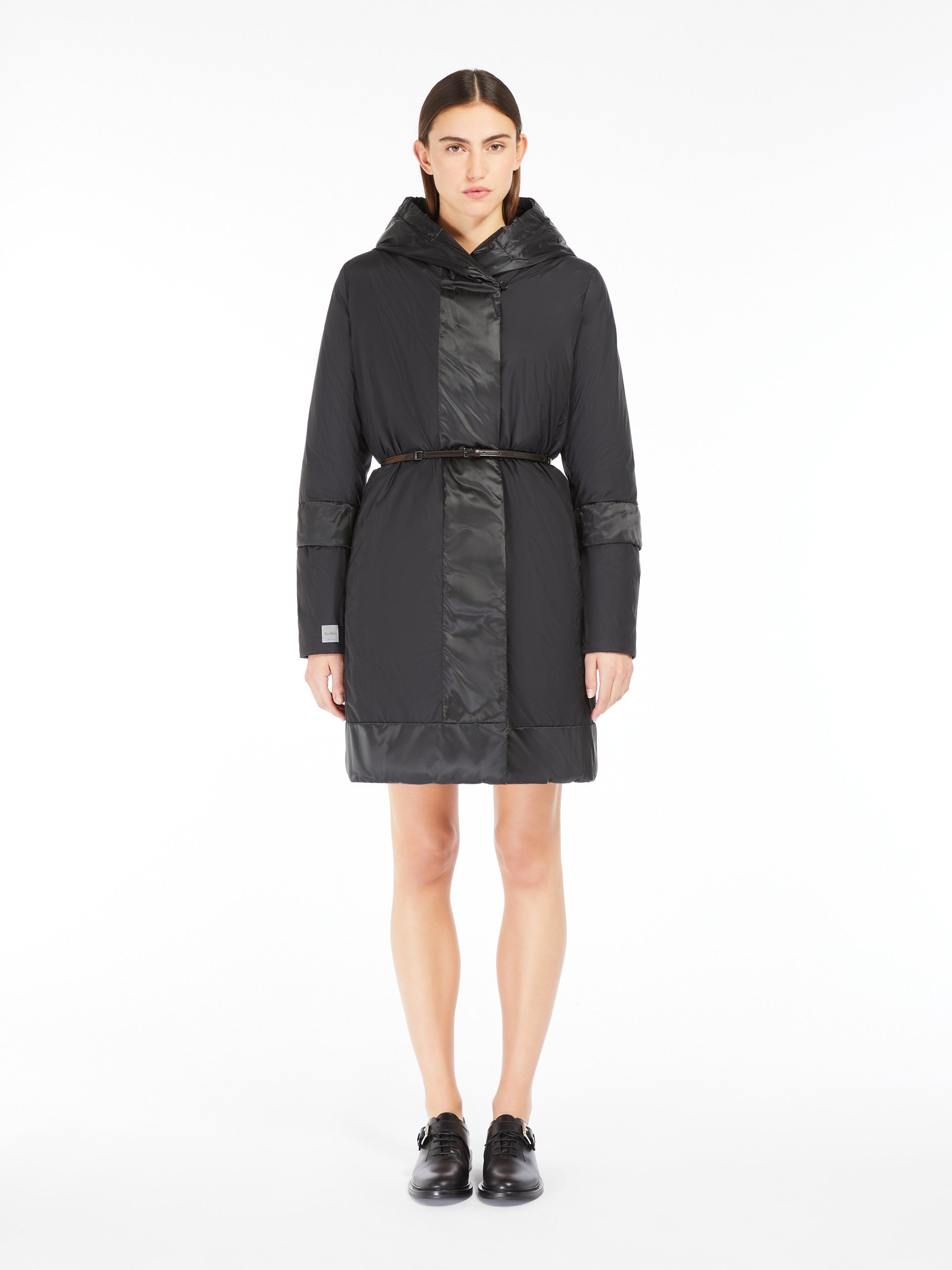 Piumino midi reversibile con cappuccio. Dotato di due cinture: una in tessuto coordinato, l'altra in nastro tecnico e pelle.