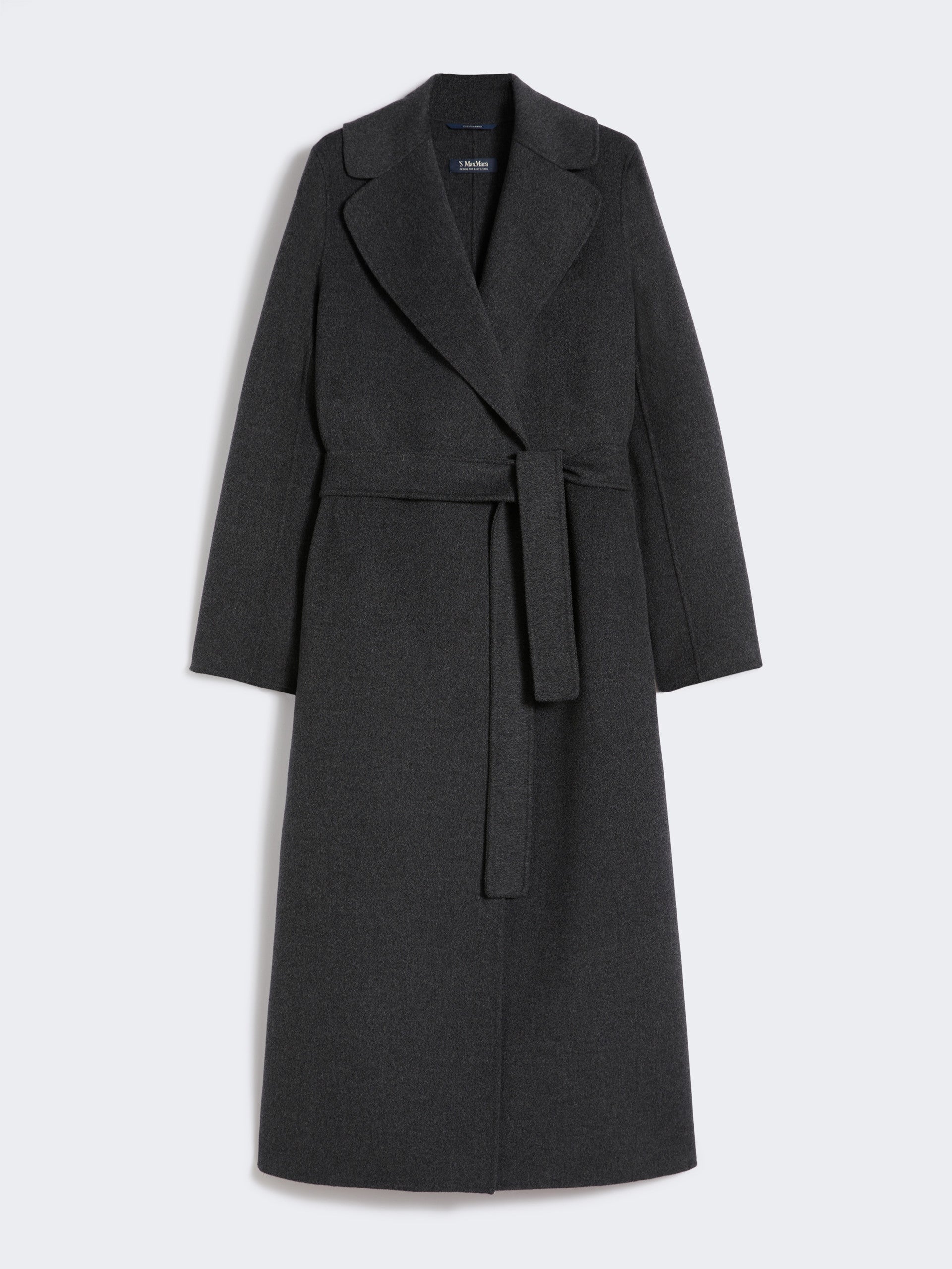 Cappotto lungo a vestaglia con ampio spacco centrale sul retro.