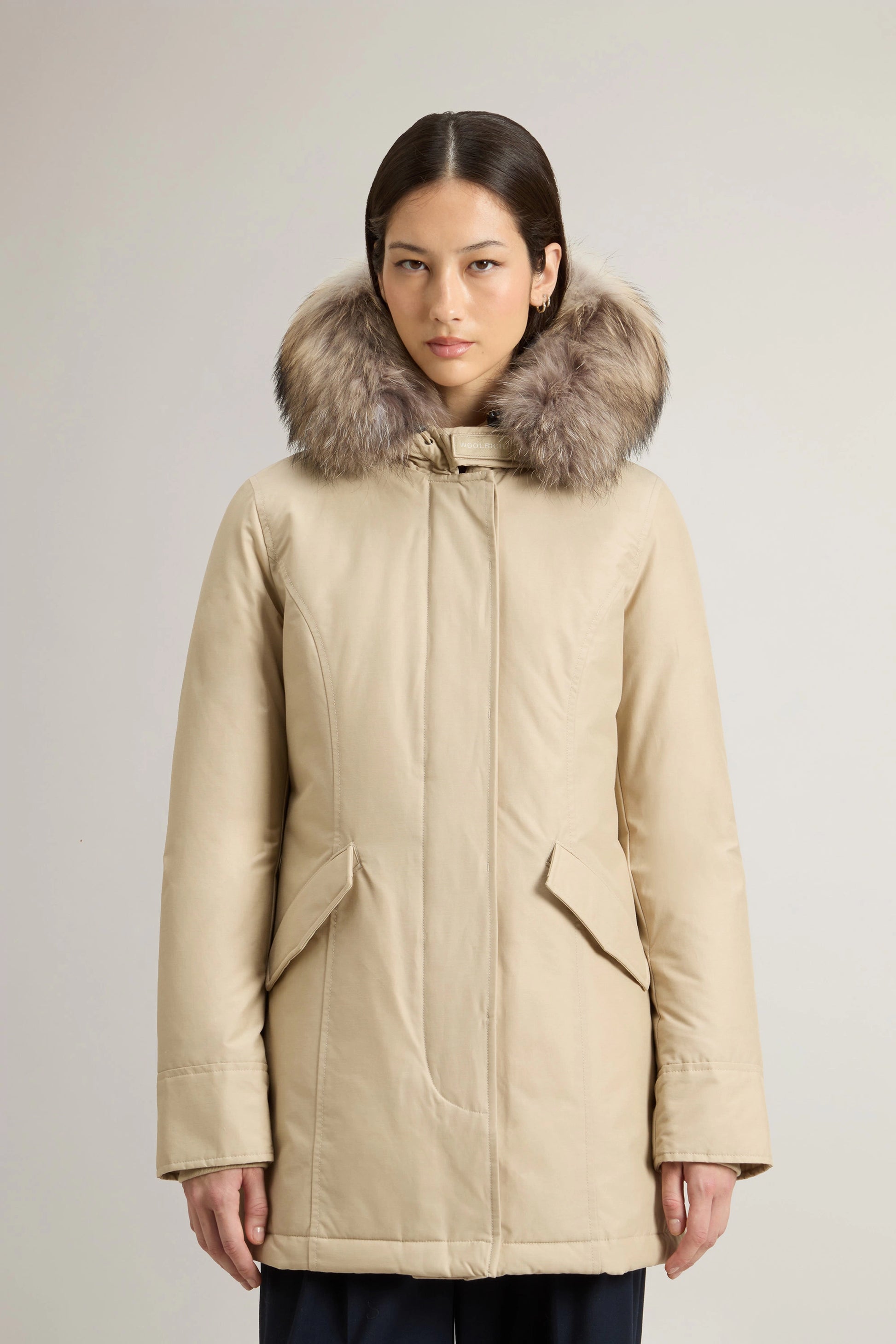 Un mix di tradizione Woolrich e femminilità contemporanea, questo modello celebra il fascino senza tempo del nostro iconico Arctic Parka, originariamente realizzato per proteggere i lavoratori degli oleodotti dell'Alaska dai rigidi climi invernali. Questa versione è realizzata con il nostro caratteristico tessuto Ramar Cloth, arricchito da una speciale finitura in Teflon che garantisce resistenza a vento e pioggia. Imbottito di piuma d'anatra per garantire il massimo del calore, ha un inserto staccabile in pelliccia sul cappuccio per un effetto accogliente e sofisticato.